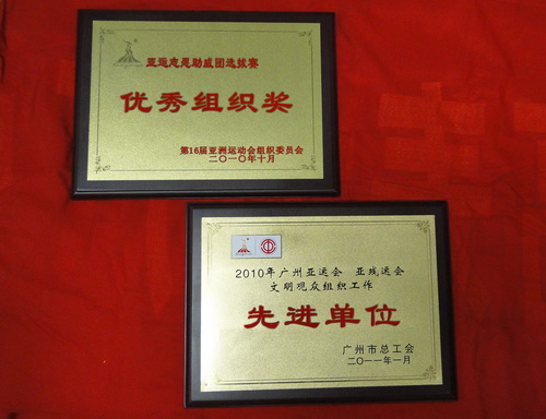領導的鼓勵激發起“廣藥潘高壽志愿者助威團”全體人員的進一步熱情,團員加倍努力。在102324日的晉級比賽中,“廣藥潘高壽志愿者助威團”在“機關企事業單位版塊志愿助威團晉級賽”中,在全省近100支團隊中獲得第8名的好成績,并獲亞組委頒發“最佳組織獎”榮譽,新年伊始,又再度獲得廣州市工會亞運會頒授“亞運亞殘運文明觀眾組織先進集體”獎