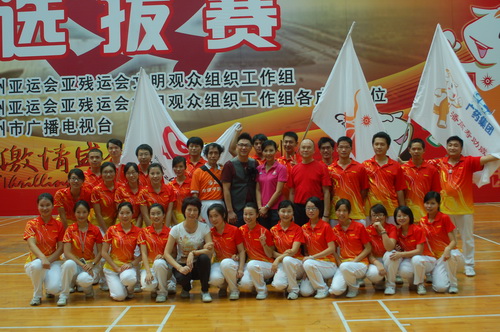 為了在“亞運志愿助威團選拔賽”取得好的成績,在廣藥集團工會的支持下,我們統一了服裝,制作了亞運旗、志愿旗和自創隊旗。根據亞組委指定的比賽規定項目和自選項目開展嚴格的訓練。